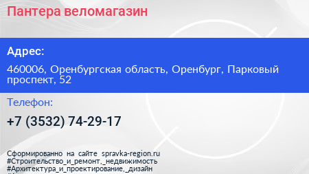 Пантера, веломагазин по адресу 460006, Оренбургская область, Оренбург, Парковый проспект, 52 в дальнейшем Организация, размещена в следующих категориях: