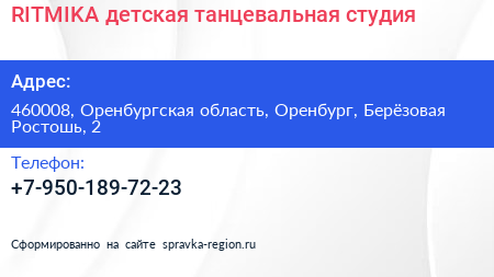 RITMIKA, детская танцевальная студия по адресу 460008, Оренбургская область, Оренбург, Берёзовая Ростошь, 2 в дальнейшем Организация, размещена в следующих категориях: