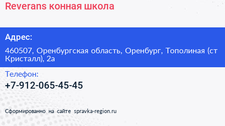 Reverans, конная школа по адресу 460507, Оренбургская область, Оренбург, Тополиная (ст Кристалл), 2а в дальнейшем Организация, размещена в следующих категориях: