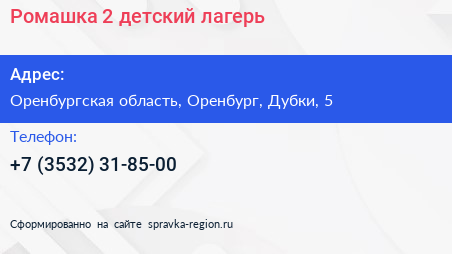 Ромашка-2, детский лагерь по адресу Оренбургская область, Оренбург, Дубки, 5 в дальнейшем Организация, размещена в следующих категориях: