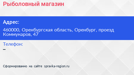Рыболовный магазин по адресу 460000, Оренбургская область, Оренбург, проезд Коммунаров, 47 в дальнейшем Организация, размещена в следующих категориях: