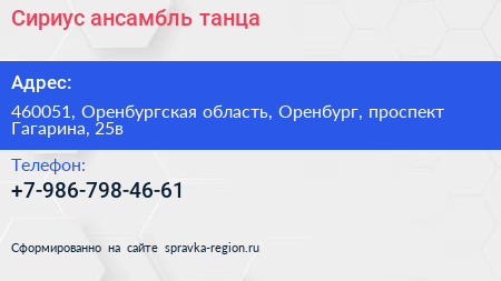 Сириус, ансамбль танца по адресу 460051, Оренбургская область, Оренбург, проспект Гагарина, 25в в дальнейшем Организация, размещена в следующих категориях: