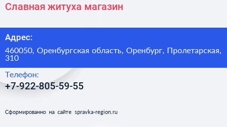 Славная житуха, магазин по адресу 460050, Оренбургская область, Оренбург, Пролетарская, 310 в дальнейшем Организация, размещена в следующих категориях:
