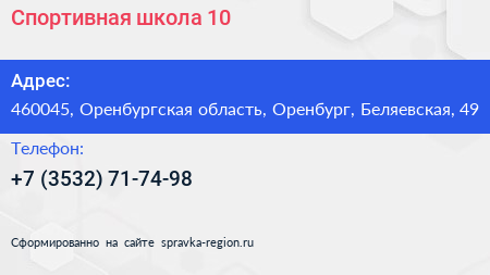 Спортивная школа №10 по адресу 460045, Оренбургская область, Оренбург, Беляевская, 49 в дальнейшем Организация, размещена в следующих категориях:
