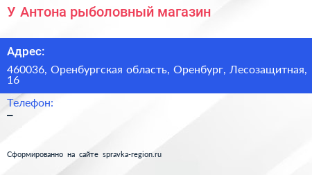 У Антона, рыболовный магазин по адресу 460036, Оренбургская область, Оренбург, Лесозащитная, 16 в дальнейшем Организация, размещена в следующих категориях: