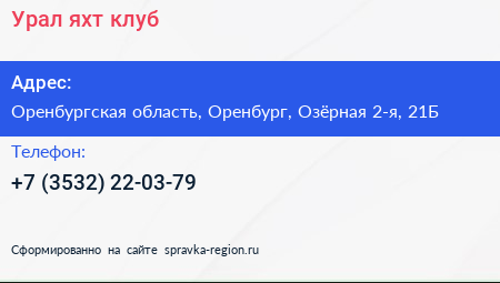 Урал, яхт-клуб по адресу Оренбургская область, Оренбург, Озёрная 2-я, 21Б в дальнейшем Организация, размещена в следующих категориях: