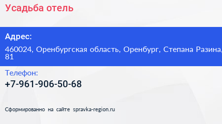 Усадьба, отель по адресу 460024, Оренбургская область, Оренбург, Степана Разина, 81 в дальнейшем Организация, размещена в следующих категориях: