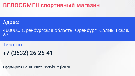 ВЕЛООБМЕН, спортивный магазин по адресу 460060, Оренбургская область, Оренбург, Салмышская, 67 в дальнейшем Организация, размещена в следующих категориях: