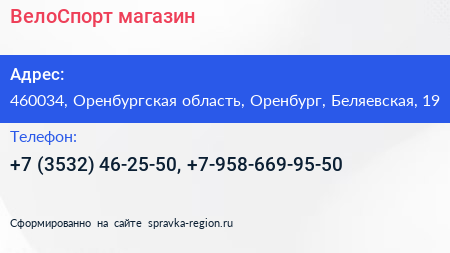 ВелоСпорт, магазин по адресу 460034, Оренбургская область, Оренбург, Беляевская, 19 в дальнейшем Организация, размещена в следующих категориях: