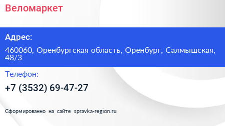 Веломаркет по адресу 460060, Оренбургская область, Оренбург, Салмышская, 48/3 в дальнейшем Организация, размещена в следующих категориях: