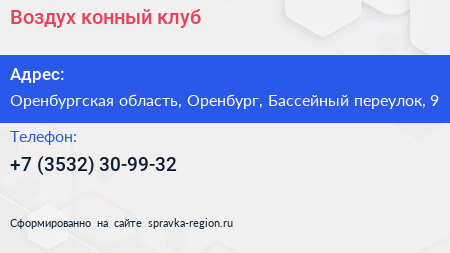 Воздух, конный клуб по адресу Оренбургская область, Оренбург, Бассейный переулок, 9 в дальнейшем Организация, размещена в следующих категориях: