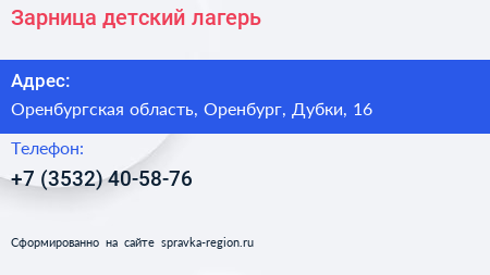 Зарница, детский лагерь по адресу Оренбургская область, Оренбург, Дубки, 16 в дальнейшем Организация, размещена в следующих категориях: