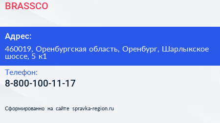 BRASSCO по адресу 460019, Оренбургская область, Оренбург, Шарлыкское шоссе, 5 к1 в дальнейшем Организация, размещена в следующих категориях: