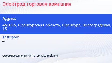 Электрод, торговая компания по адресу 460056, Оренбургская область, Оренбург, Волгоградская, 15 в дальнейшем Организация, размещена в следующих категориях: