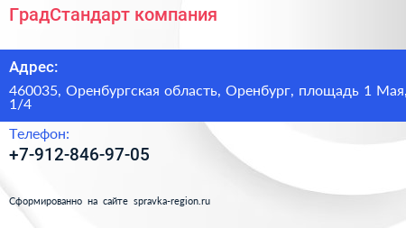 ГрадСтандарт, компания по адресу 460035, Оренбургская область, Оренбург, площадь 1 Мая, 1/4 в дальнейшем Организация, размещена в следующих категориях: