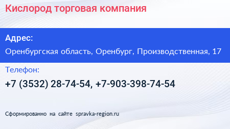 Кислород, торговая компания по адресу Оренбургская область, Оренбург, Производственная, 17 в дальнейшем Организация, размещена в следующих категориях: