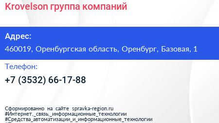 Krovelson, группа компаний по адресу 460019, Оренбургская область, Оренбург, Базовая, 1 в дальнейшем Организация, размещена в следующих категориях: