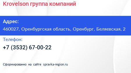 Krovelson, группа компаний по адресу 460027, Оренбургская область, Оренбург, Беляевская, 2 в дальнейшем Организация, размещена в следующих категориях: