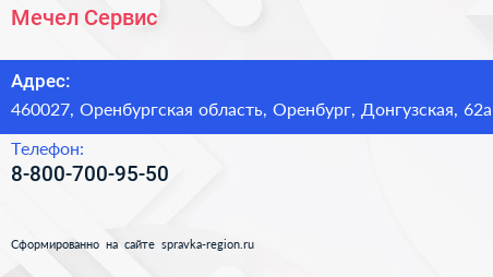 Мечел-Сервис по адресу 460027, Оренбургская область, Оренбург, Донгузская, 62а в дальнейшем Организация, размещена в следующих категориях: