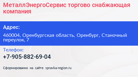МеталлЭнергоСервис, торгово-снабжающая компания по адресу 460004, Оренбургская область, Оренбург, Станочный переулок, 7 в дальнейшем Организация, размещена в следующих категориях: