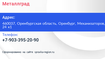 Металлград по адресу 460037, Оренбургская область, Оренбург, Механизаторов, 24 к1 в дальнейшем Организация, размещена в следующих категориях: