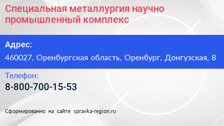 Специальная металлургия, научно-промышленный комплекс по адресу 460027, Оренбургская область, Оренбург, Донгузская, 8 в дальнейшем Организация, размещена в следующих категориях: