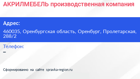 АКРИЛМЕБЕЛЬ, производственная компания по адресу 460035, Оренбургская область, Оренбург, Пролетарская, 288/2 в дальнейшем Организация, размещена в следующих категориях: