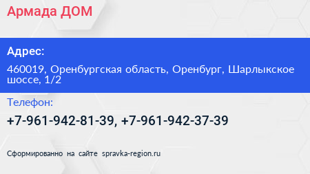 Армада ДОМ по адресу 460019, Оренбургская область, Оренбург, Шарлыкское шоссе, 1/2 в дальнейшем Организация, размещена в следующих категориях: