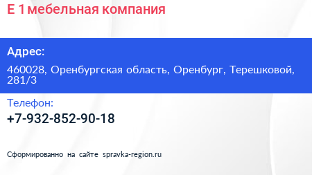 E-1, мебельная компания по адресу 460028, Оренбургская область, Оренбург, Терешковой, 281/3 в дальнейшем Организация, размещена в следующих категориях: