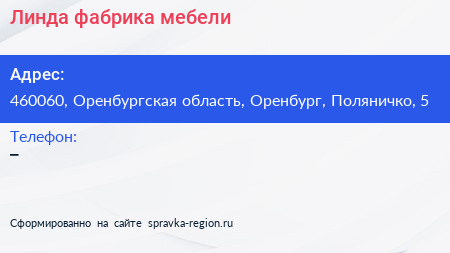 Линда, фабрика мебели по адресу 460060, Оренбургская область, Оренбург, Поляничко, 5 в дальнейшем Организация, размещена в следующих категориях: