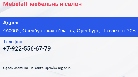 Mebeleff, мебельный салон по адресу 460005, Оренбургская область, Оренбург, Шевченко, 20Б в дальнейшем Организация, размещена в следующих категориях: