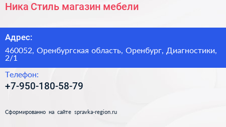 Ника Стиль, магазин мебели по адресу 460052, Оренбургская область, Оренбург, Диагностики, 2/1 в дальнейшем Организация, размещена в следующих категориях: