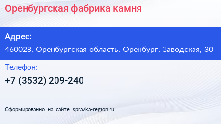 Оренбургская фабрика камня по адресу 460028, Оренбургская область, Оренбург, Заводская, 30 в дальнейшем Организация, размещена в следующих категориях: