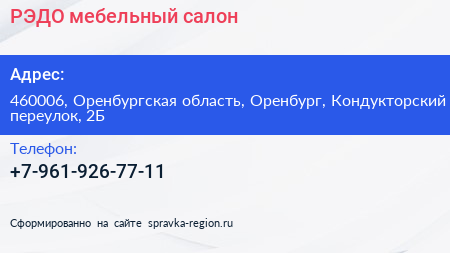 РЭДО, мебельный салон по адресу 460006, Оренбургская область, Оренбург, Кондукторский переулок, 2Б в дальнейшем Организация, размещена в следующих категориях: