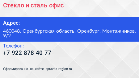Стекло и сталь, офис по адресу 460048, Оренбургская область, Оренбург, Монтажников, 9/2 в дальнейшем Организация, размещена в следующих категориях: