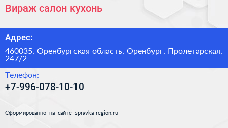 Вираж, салон кухонь по адресу 460035, Оренбургская область, Оренбург, Пролетарская, 247/2 в дальнейшем Организация, размещена в следующих категориях:
