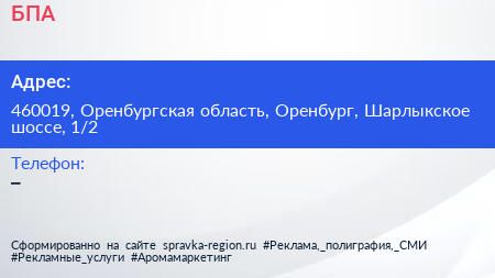 БПА по адресу 460019, Оренбургская область, Оренбург, Шарлыкское шоссе, 1/2 в дальнейшем Организация, размещена в следующих категориях: