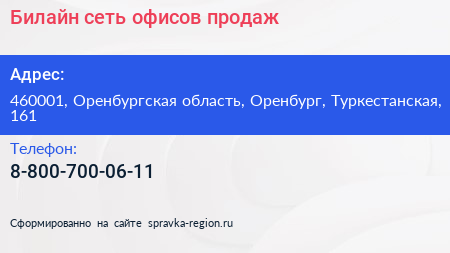 Билайн, сеть офисов продаж по адресу 460001, Оренбургская область, Оренбург, Туркестанская, 161 в дальнейшем Организация, размещена в следующих категориях: