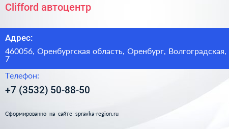 Clifford, автоцентр по адресу 460056, Оренбургская область, Оренбург, Волгоградская, 7 в дальнейшем Организация, размещена в следующих категориях: