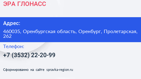 ЭРА-ГЛОНАСС по адресу 460035, Оренбургская область, Оренбург, Пролетарская, 262 в дальнейшем Организация, размещена в следующих категориях: