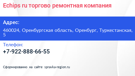 Echips.ru, торгово-ремонтная компания по адресу 460024, Оренбургская область, Оренбург, Туркестанская, 5 в дальнейшем Организация, размещена в следующих категориях: