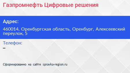 Газпромнефть-Цифровые решения по адресу 460014, Оренбургская область, Оренбург, Алексеевский переулок, 5 в дальнейшем Организация, размещена в следующих категориях: