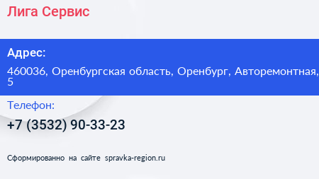 Лига-Сервис по адресу 460036, Оренбургская область, Оренбург, Авторемонтная, 5 в дальнейшем Организация, размещена в следующих категориях: