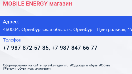 MOBILE ENERGY, магазин по адресу 460034, Оренбургская область, Оренбург, Центральная, 19 в дальнейшем Организация, размещена в следующих категориях: