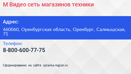 М.Видео, сеть магазинов техники по адресу 460060, Оренбургская область, Оренбург, Салмышская, 71 в дальнейшем Организация, размещена в следующих категориях: