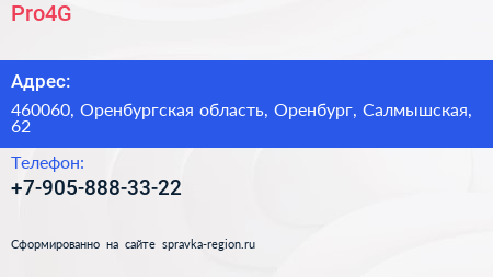 Pro4G по адресу 460060, Оренбургская область, Оренбург, Салмышская, 62 в дальнейшем Организация, размещена в следующих категориях: