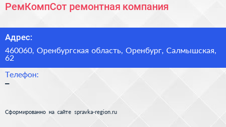 РемКомпСот, ремонтная компания по адресу 460060, Оренбургская область, Оренбург, Салмышская, 62 в дальнейшем Организация, размещена в следующих категориях: