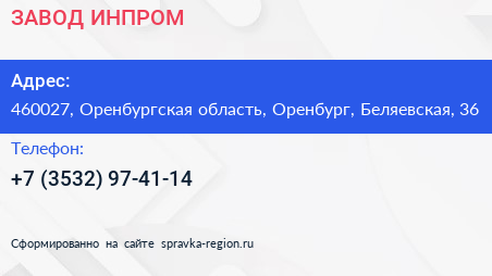 ЗАВОД ИНПРОМ по адресу 460027, Оренбургская область, Оренбург, Беляевская, 36 в дальнейшем Организация, размещена в следующих категориях: