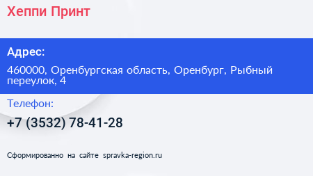 Хеппи Принт по адресу 460000, Оренбургская область, Оренбург, Рыбный переулок, 4 в дальнейшем Организация, размещена в следующих категориях: