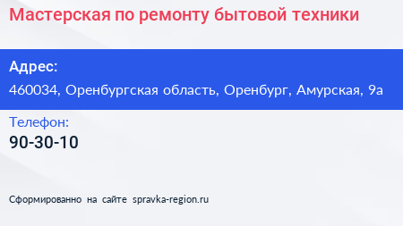 Мастерская по ремонту бытовой техники по адресу 460034, Оренбургская область, Оренбург, Амурская, 9а в дальнейшем Организация, размещена в следующих категориях:
